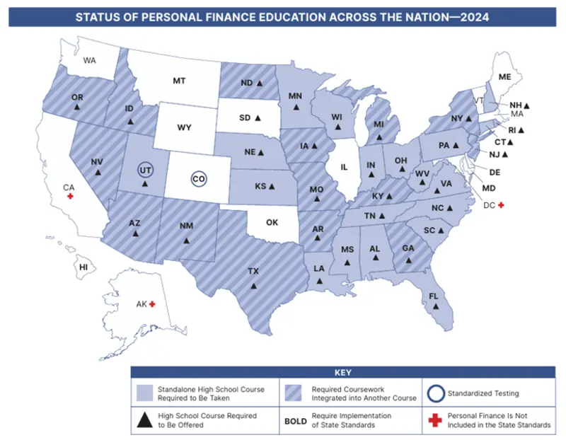 So let’s get this going! A survey conducted by the Council of Economic Education (CEE) reveals that 35 states now mandate high school students to complete a personal finance course for graduation, a significant increase from 23 states just two years prior (see map below). However, high school students are scoring a mere 57.5% on financial literacy tests on average (yes, that is an F on a typical grading scale if anyone was wondering), underscoring a crucial knowledge gap. The current landscape of financial literacy education in America’s public schools leaves much to be desired, highlighted by this concerning statistic.